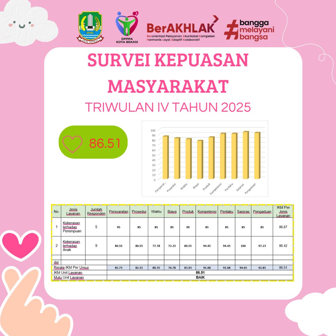 Hasil SKM Triwulan IV Yang Dilakukan Pada Tanggal 1 S.d 31 Oktober 2025 Terhadap Layanan Yang Diselenggarakan Oleh DPPPA Kota Bekasi Adalah 86.51 dengan Mutu Layanan BAIK.